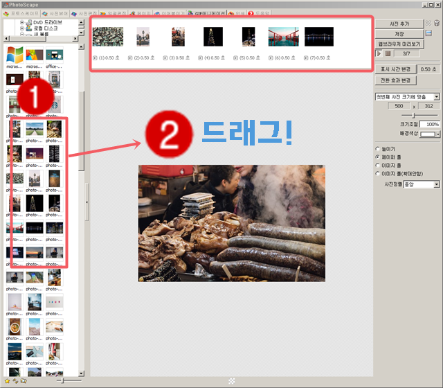 본인 pc에서 GIF로 변환할 사진을 옮기시면 됩니다. 왼쪽에서 변환한 파일을 미리 한 폴더에 넣어두셨다가 2의 화면에 드래그하시면 상단에 목록이 나열되면서 GIF 변환할 준비가 끝났습니다.