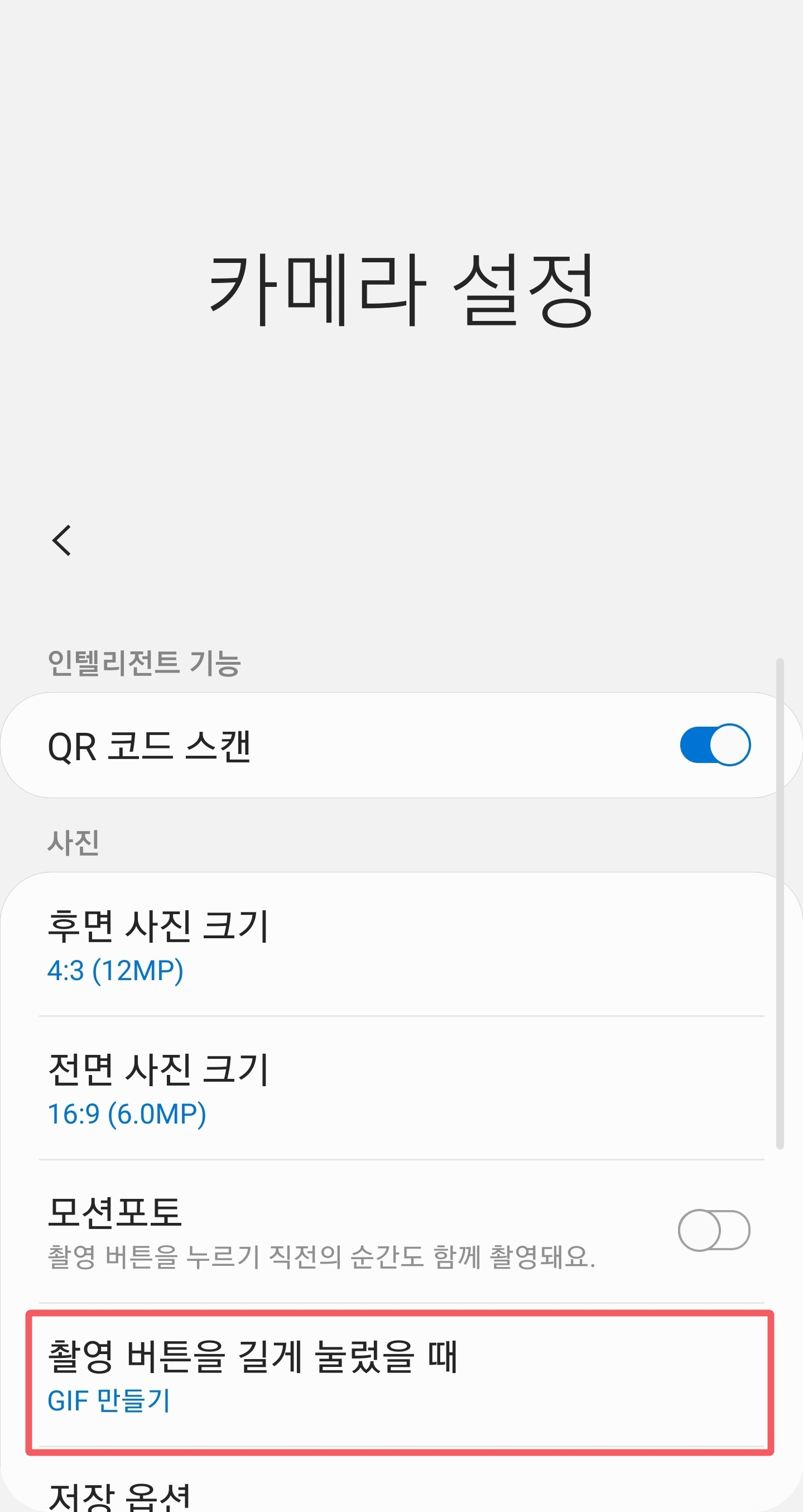 이후 카메라 설정에서 여러 가지 항목이 있지만 촬영 버튼을 길게눌렀을 때 항목에서 대부분 고속 연속 촬영으로 되어있을 겁니다. 하지만 이항목을 GIF 만들기로 바꿔주시면 됩니다. 매우 간단합니다.