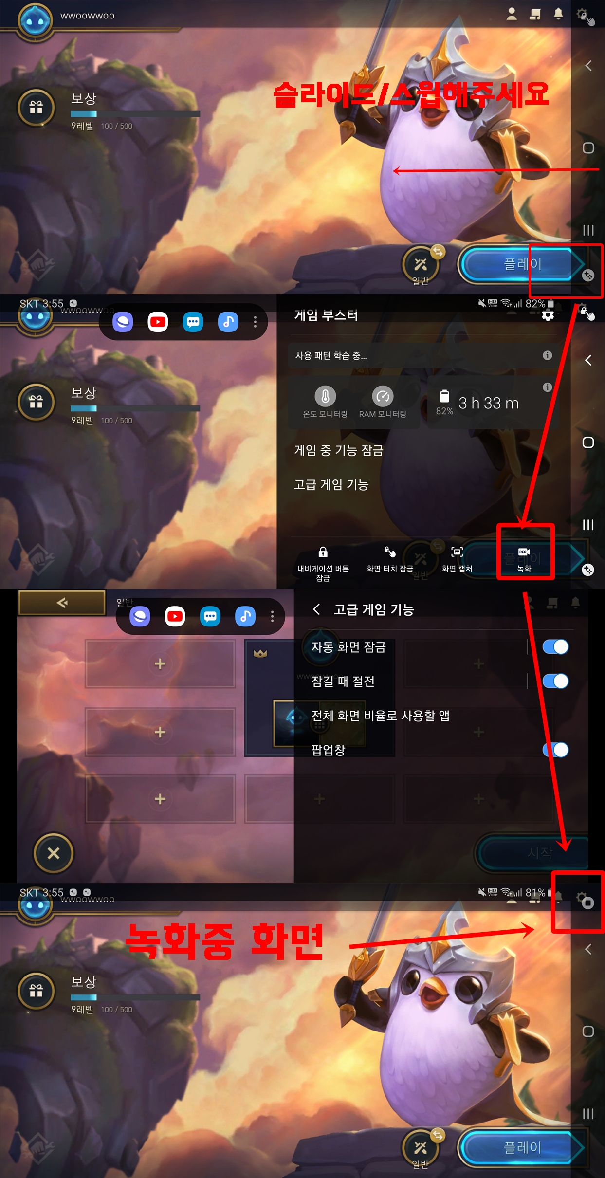 요즘 가끔 즐겨하는 게임인 롤토체스 모바일입니다. 가로화면 모드에서 스마트폰 하단부를 스윕/슬라이드 하시면 화면 하단 우측에 게임패드 모양이 나옵니다. 그 모양을 클릭해주시면 게임 런처, 구글 플레이 게임의 설정창이 나오는데 바로 녹화하기를 누르시면 녹화모드에 돌입하게 됩니다. 캡처도 물론 가능합니다.