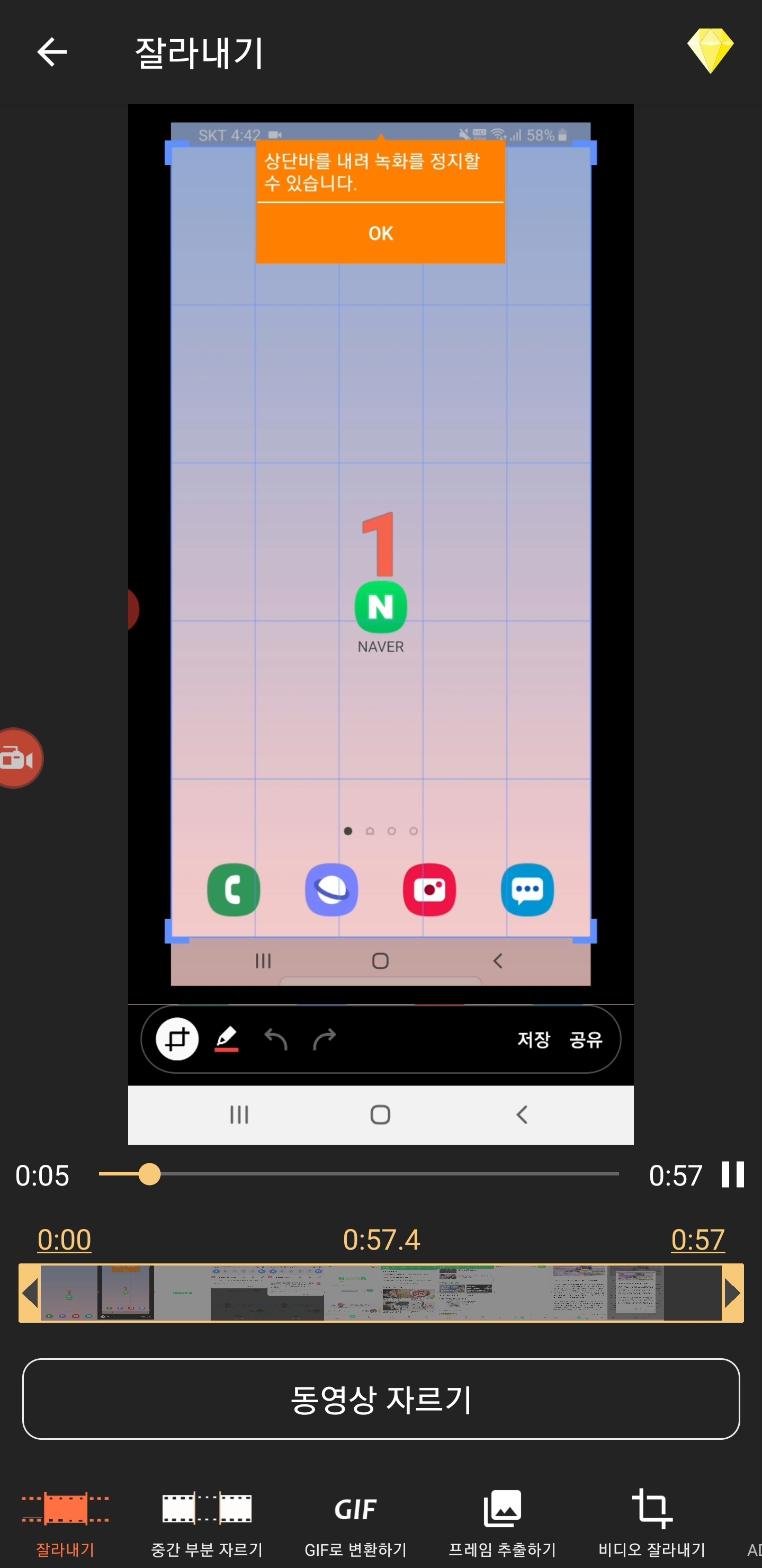 위 상단 화면을 내려서 녹화를 중지, 일시정지할 수 있으며 촬영을 마치고는 동영상 화면을 바로 편집할 수 있어서 굉장히 유용하게 사용할 수 있습니다. 본인이 원하는 부분부터 시작하거나 중간에 잘못한 부분이 있으면 잘라내서 보이는 영상을 깔끔하게 처리할 수 있는 편집 기능이 있어서 더욱 유용한 어플이네요.