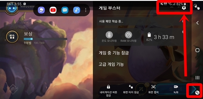 먼저 게임 화면에서 하단의 게임패드 모양을 누르시고 게임 부스터 톱니바퀴를 눌러주세요