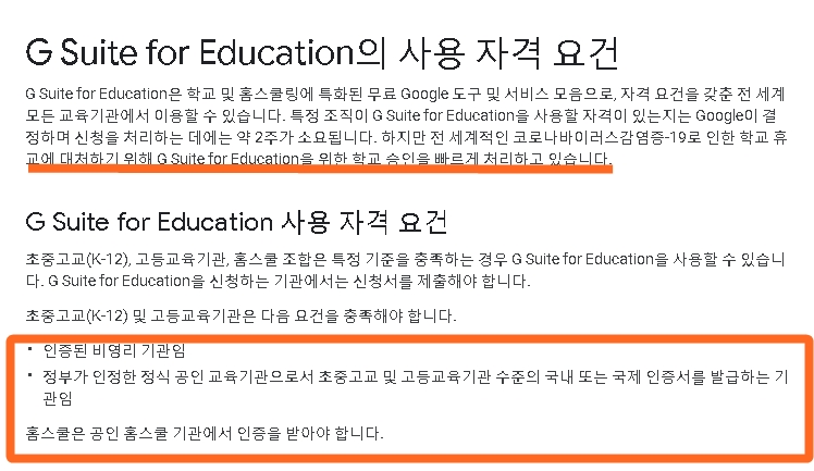 구글에서 지원해주는 G Suite foe Education 입니다. 구글드라이브는 국가지정 교육기관인 경우에는 무료로 드라이브를 사용할 수 있게 도와주고 있습니다. 아래의 주황색 박스에 있는 조건을 충족하는 국내의 초 중 고등학교에서 무료로 사용할 수 있습니다. 승인은 약 2주 소요되지만 학교 휴고에 대처하기 위해서 승인을 빠르게 진행중이라고 합니다.