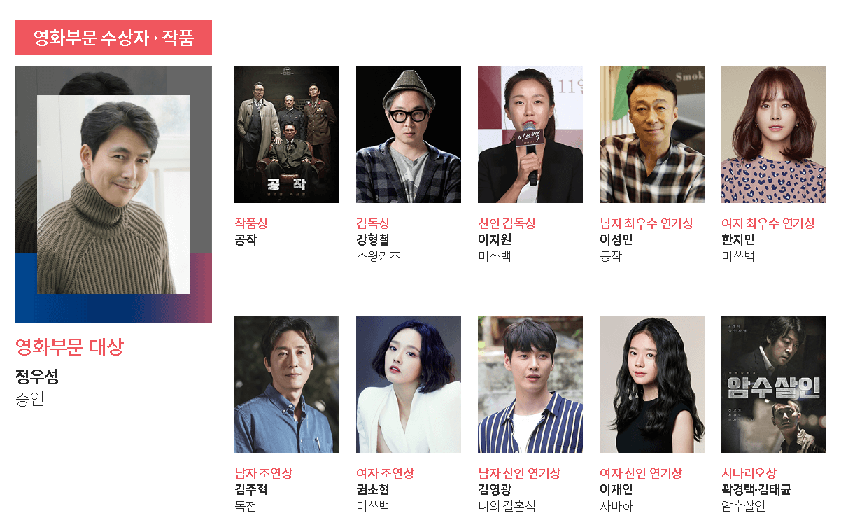 부문마다 TV와 영화 각기 1편이나 개인1명을 선정하여 시상합니다. 지난 2019년 백상예술대상에서 대상과 작품상 등 수상자들 내역 입니다. 영화 증인에서 좋은 연기를 선보인 잘생김을 아는 배우 정우성님께서 수상하셨으며, 수상한 작품과 개인을 살펴보면 인상깊은 연기와 잘만든 작품들이 상을 받았습니다.