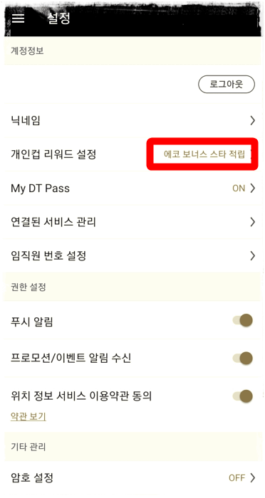 개인컵 리워드설정에서 에코보너스 스타적립이나 300원 할인을 설정해주셔야 합니다.