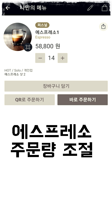 나만의 메뉴에서 샷을 2로 변경해주시고,주문에 들어갑니다.