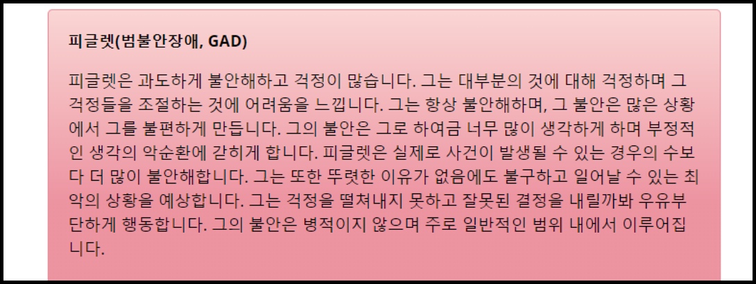 피글렛은 불안의 행동사항이나 정신상태를 가지고 있다고 합니다.