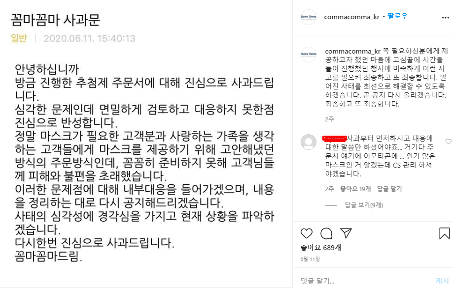 꼼마꼼마는 지난 6월 11일 마스크 추첨제를 통해서 마스크를 판매하려고 했습니다.