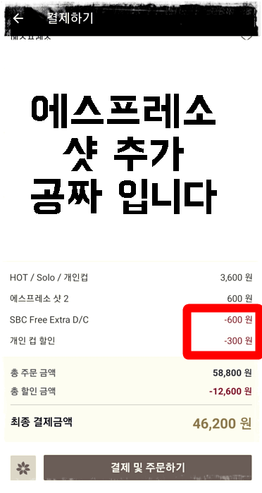 ▷신용카드 복합 결제시 샷추가 할인은 없지만 개인컵 할인 -300원과 체크카드,신용카드 할인이 적용되어