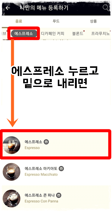 사이렌오더>나만의메뉴>나만의메뉴등록(오른쪽상단+) > 상단 바에서 에스프레소 > 스크롤 아래로
