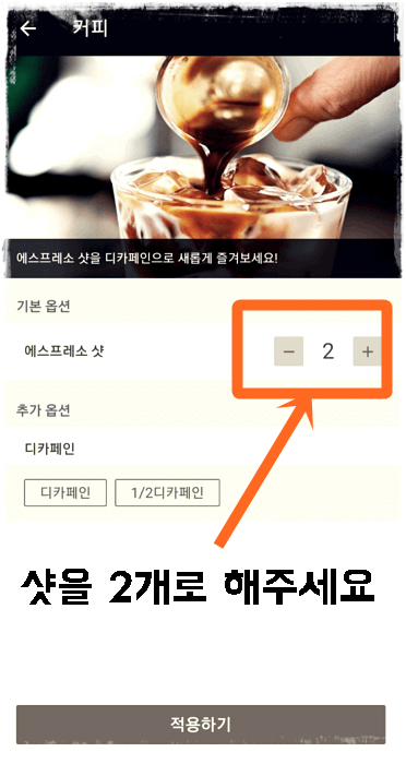 나만의 메뉴에서 샷을 2로 변경해주시고,주문에 들어갑니다.
