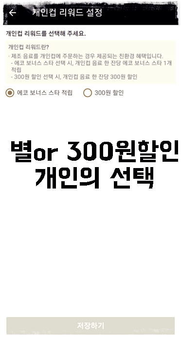 개인컵 리워드설정에서 에코보너스 스타적립이나 300원 할인을 설정해주셔야 합니다.
