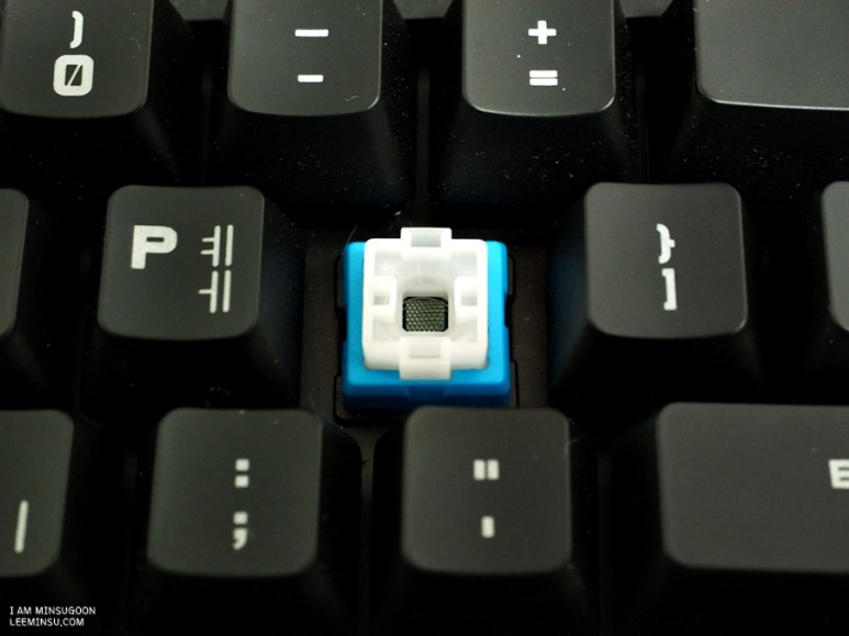 기계식키보드중 청축으로 제작된 키보드의 특징은 경쾌한 키감, 그리고 경쾌한 만큼 시끄러운 키보드 소리가 아닐까요? PC방에 가장 널리 보급되고 있는 제품의 청축 스위치 키보드입니다. 슬라이더와 용수철 사이 분리된 형태로 제작된 청축 키보드는 접점부에서 살짝 걸리는 느낌의 소리가 나고 클릭 방식의 키보드입니다. 키압은 50g 정도이며 특유의 철컥, 찰칵 소리와 촉감이 경쾌함이 특징입니다.
