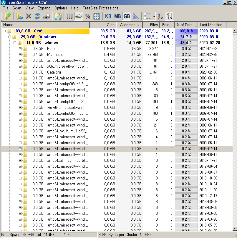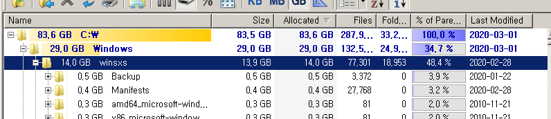 트리 사이즈를 통한 제 C드라이브입니다. 예전에 구매한 SSD를 아직까지 사용하고 있기에 스스디 용량이 좀 적습니다. 하지만 아직까지도 문제없이 잘 굴러가기에 문제없이 잘 사용하고 있습니다. 하지만 SSD 용량은 80% 정도만 사용해야 된다는 커뮤니티의 글을 보고 PC정리를 해봤는데요. 가장 큰 덩어리인 Winsxs를 찾았습니다.