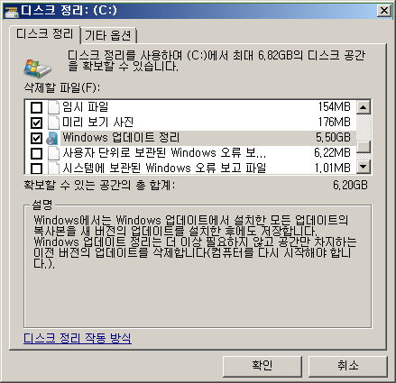 Windows 업데이트 정리와 다른 삭제해야 될 파일들이 뜹니다. 모두 체크해주시고 확인을 눌러주시면 됩니다.
