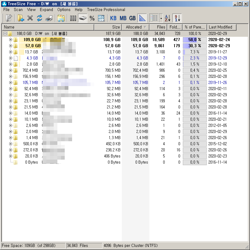 먼저 용량 정리하기 전 프로그램을 하나 사용하자면 TreeSize라는 프로그램입니다. 사이트 검색을 통해서 쉽게 다운로드할 수 있고요. 드라이브의 용량을 퍼센티지와 GB로 보기 쉽게 보여줘서 굉장히 정리하기 편합니다.