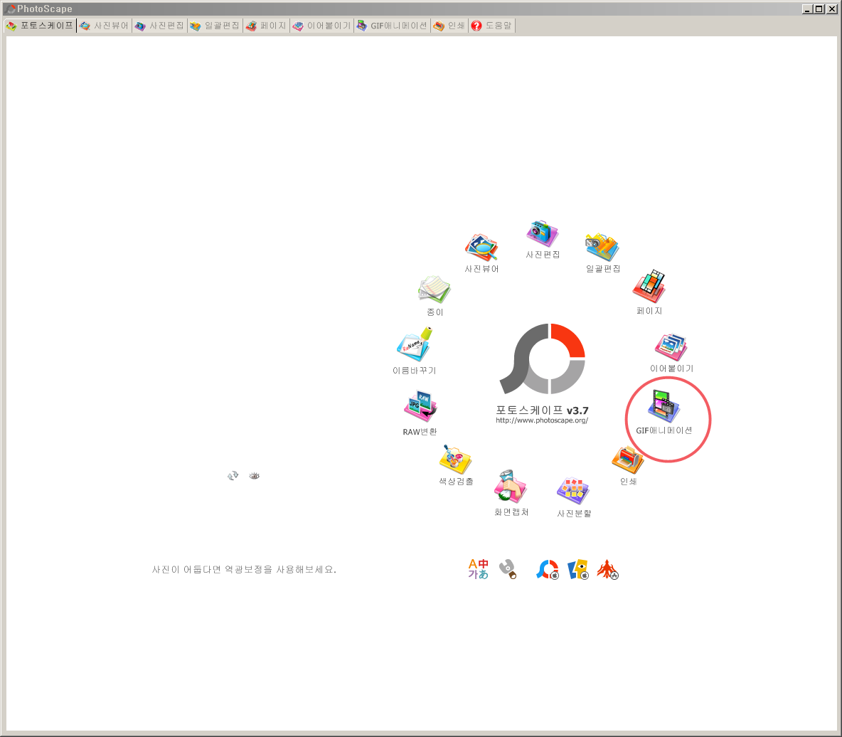 첫 화면을 보시면 아이콘이 나열되어있는데 오른쪽에 GIF 애니메이션이 보이실 거예요. 클릭해서 들어가면 됩니다. 그 외에도 포토스케이프는 많은 기능이 있는데요. 천천히 하나씩 소개해 드리겠습니다.