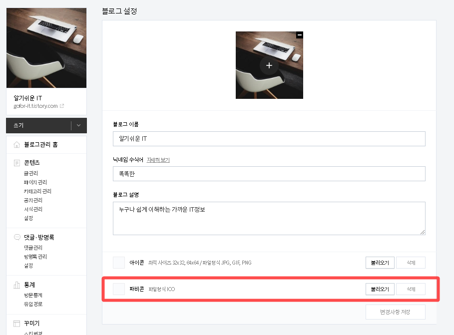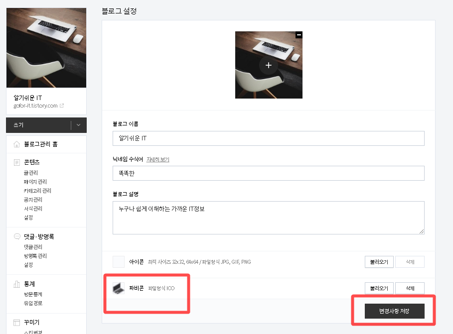 파비콘을 불러와서 아까 만든 파일을 등록해보겠습니다. 변경사항 저장을 꼭 눌러주세요!