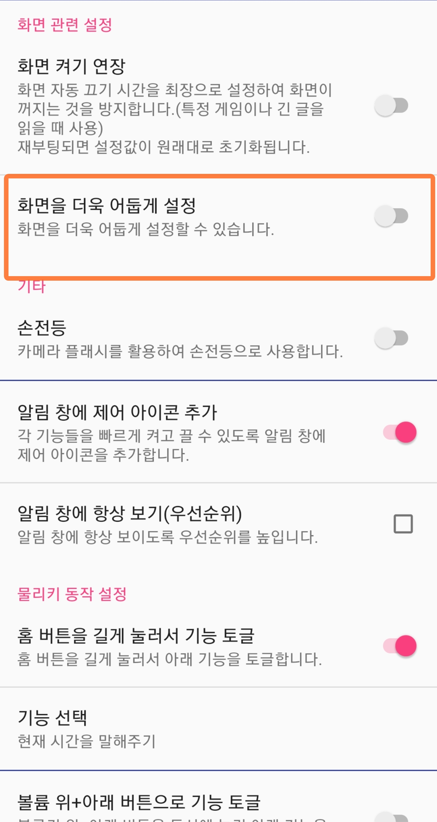 화면을 더욱 어둡게 설정할 수 있기 때문이죠 어플에 들어가셔서 어둡게 설정 항목을 활성화시키세요