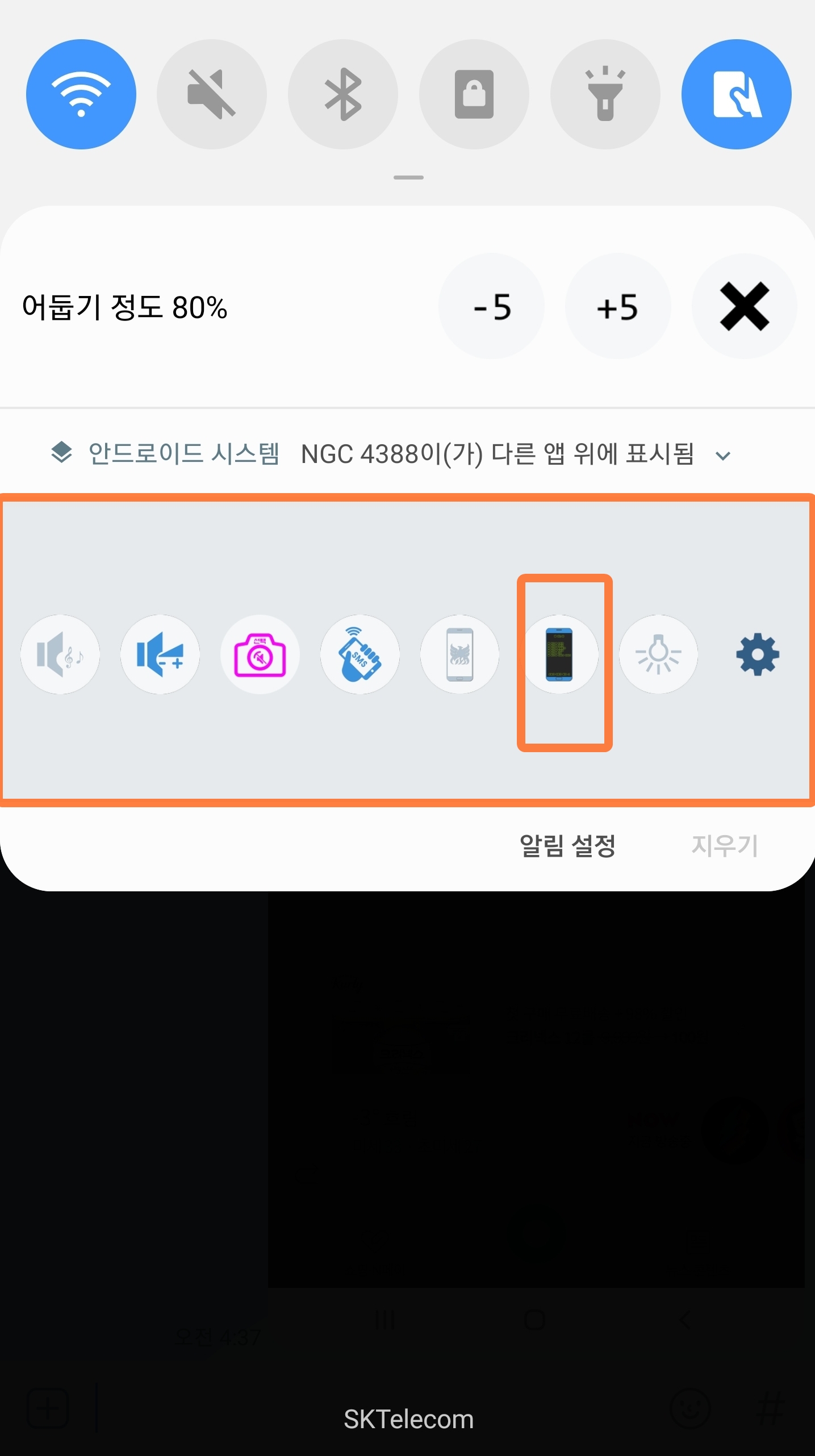 화면 상단에서 설정창을 스윕 해서 활성화시키시면 화면이 까만 아이콘이 보이실 거예요. 그 아이콘을 클릭하시면 어둡기 정도가 뜹니다. 플러스 마이너스로 화면 밝기를 조절하세요. 오른쪽 화면처럼 어둡게 출력됩니다. 이건 80%로 설정해서 굉장히 어둡게 보이는데 50~40% 정도만 사용하셔도 무난하게 사용할 수 있습니다. 확실히 눈이 안 아파요. 잠들기 전 폰 만질 때 유용한 어플입니다.