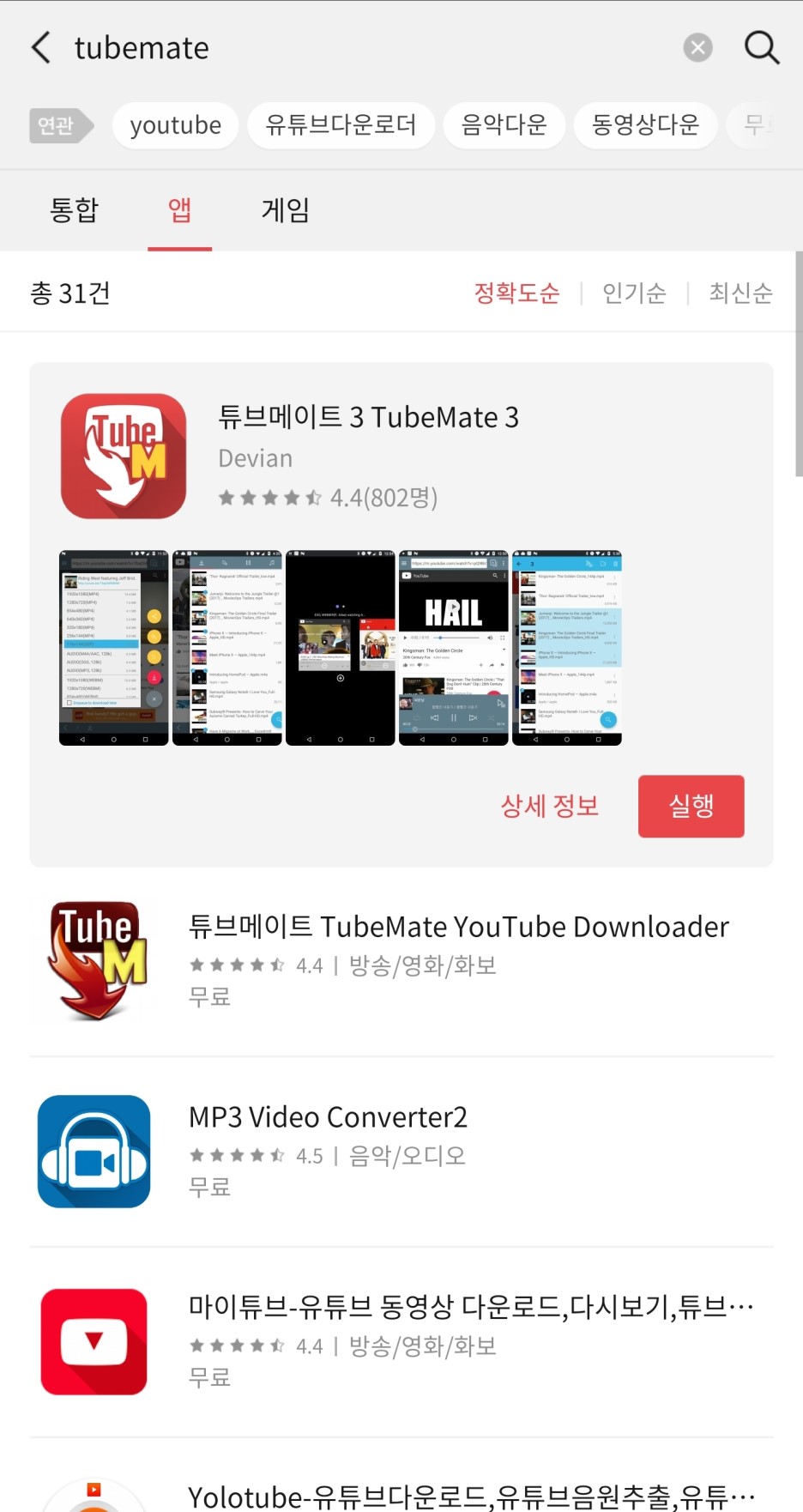 어플을 다운받으시면서 추가로 1개의 어플을 받아주세요. 비디오 mp3 컨버터라는 프로그램인데 필수로 받아주셔야지 tubemate가 제대로 작동을 합니다.