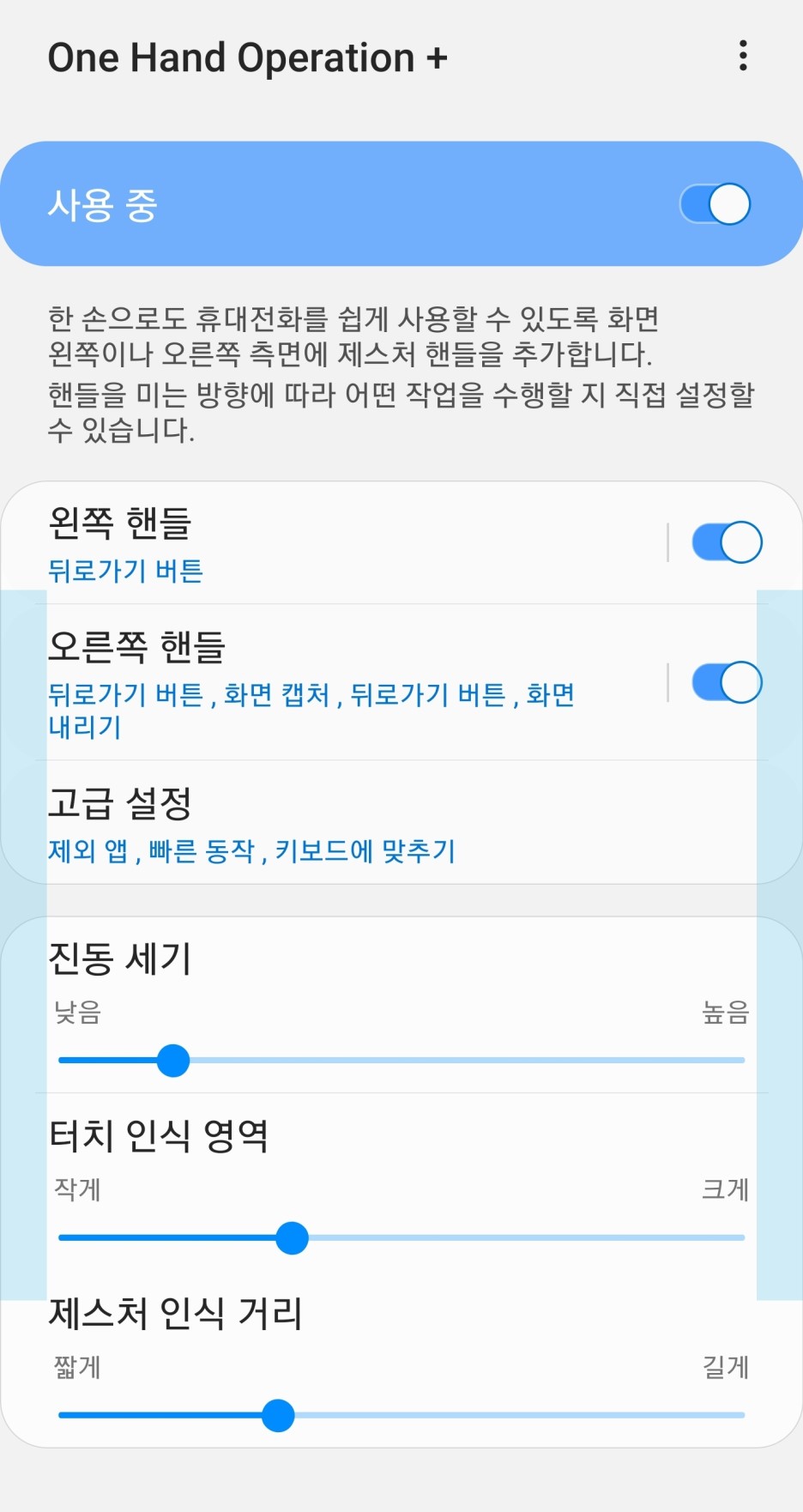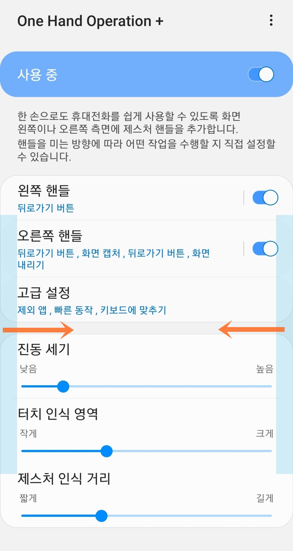 이렇게 가장자리에서 화면을 안쪽으로 툭툭 쳐주거나 스윞해주시면 실행되는 어플입니다. 양쪽에 파란색 부분이 터치 인식 영역입니다. 화면에서도 볼 수 있듯이 크기와 높이 인식거리를 조절할 수 있습니다. 몇 번 사용하시고 본인의 손의 크기나 위치에 맞게 조절하시면 되겠습니다