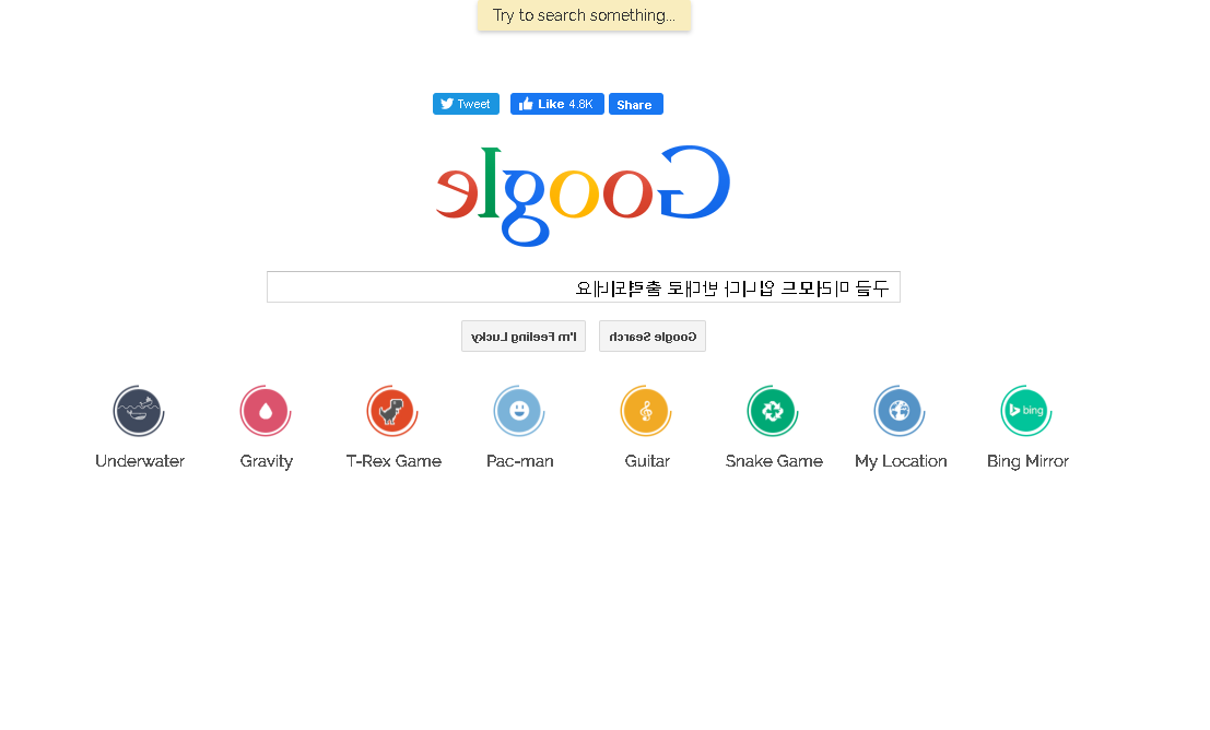 구글 미러 모드 기본 창입니다. 구글 문양이 반대로 된 것을 볼 수 있습니다. 아임 필링 러키도 반대로 되어있네요