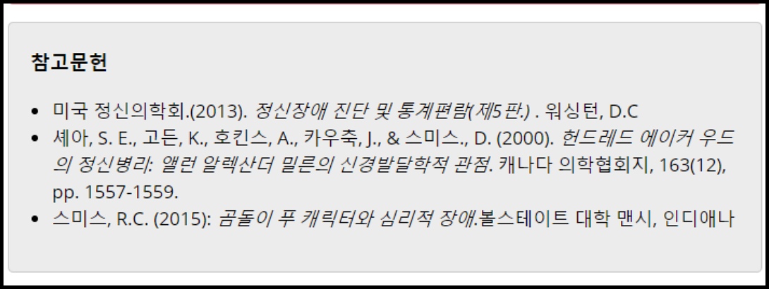 사라 E 셰아 교수와 케빈고든박사와 동료들이 곰돌이 푸 캐릭터를 분석해왔다고 합니다. 그리고 각각의 캐릭터들의 특색과 캐릭터를 분석하여 명확한 정신학적인 진단을 내릴수 있다고 판단했다고 합니다.
