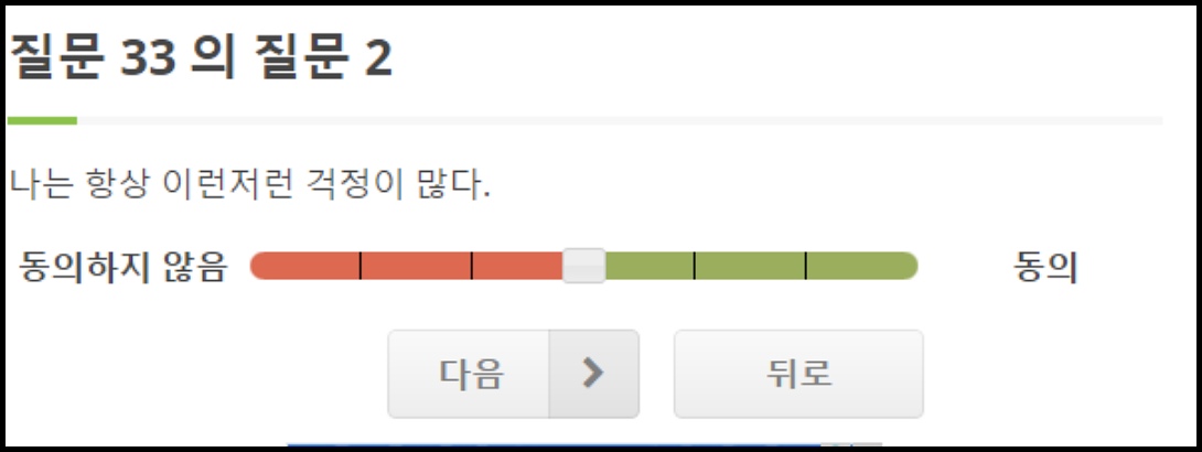 테스트는 정말 간단합니다. 물어보는 질문에 자신이 해당되는 부분에 점수를 매겨서 다음을 선택하면 됩니다.