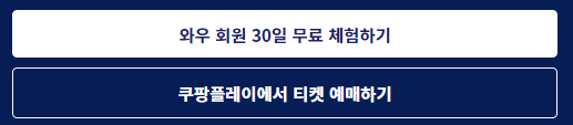 쿠팡와우를 한번도 사용하지 않은 분들이라면 와우 회원 30일 무료체험하기를 신청 한후 쿠팡 플레이에서 티켓 예매가 가능합니다. 한달 가입비를 내지 않아도 가능하며 30일 이전에 무료 체험하기를 종료하시면 요금을 내지 않고 토트넘 경기 관람과 토트넘 티켓팅이 가능 합니다.