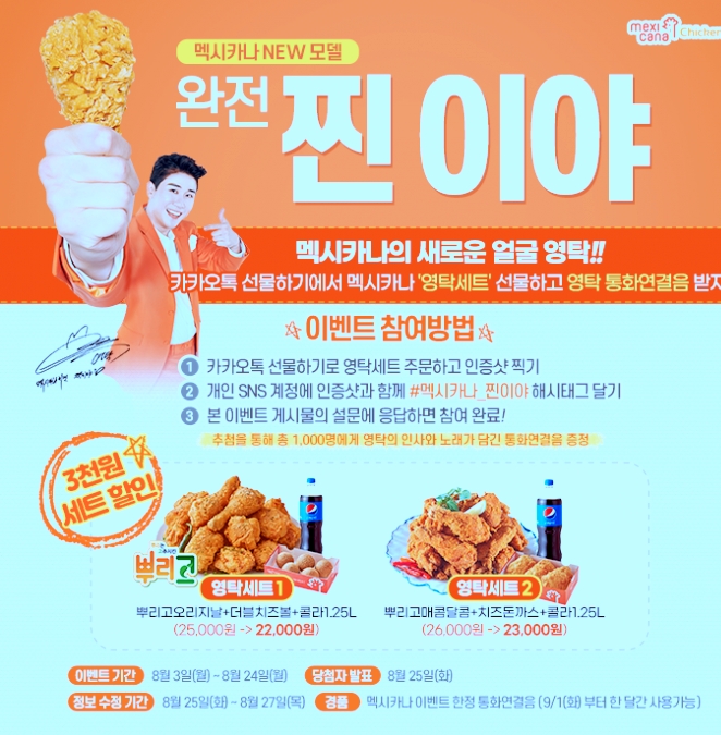 카카오톡에서 영탁 세트를 고 매하시고 개인 SNS 계정에서 인증샷과 멕시카나 찌니야라는 해시 태그를 발견되면 본 이벤트에 응모가 됩니다 이벤트 기간은 8월 3일 월요일부터 8월 24일 월요일까지 삼주간 진행되는데요 이벤트가 마친 8월 25일 화요일에는 경품을 당첨자 발표를 확인합니다 경품은 영탁에 직접 녹음한 인삿말과 영탁의 노래가 담긴 통화 연결 음이 제공되며 총 000명의 고객에게 진정이 됩니다 통화 연결 음은 9월 1일부터 1 달 동안 송출이 되면서 서비스될 예정입니다