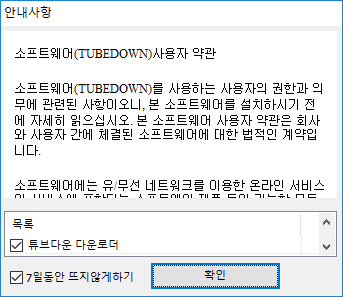 카카오인코더를 설치하고나서 이런 프로그램을 설치한다는 내용이 떴습니다. Tubedown이라는 소프트웨어로 안내사항이 뜨는데, 솔직히 이런거 떠도 잘 읽지않습니다. 그리고 취소하는 버튼이란 없네요. 확인밖에 없습니다. 이창을 끄는 방법은