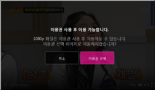 고화질로 시청하기 위해서는 추가적인 금액결제가 필요합니다. 360p는 무료로 시청이가능하지만 480p부터는 기간제 이용권 구매가 필요합니다. 이용권은 이천이백원으로 한번 결제시 30일간 실시간 고화질 이용이 가능합니다.