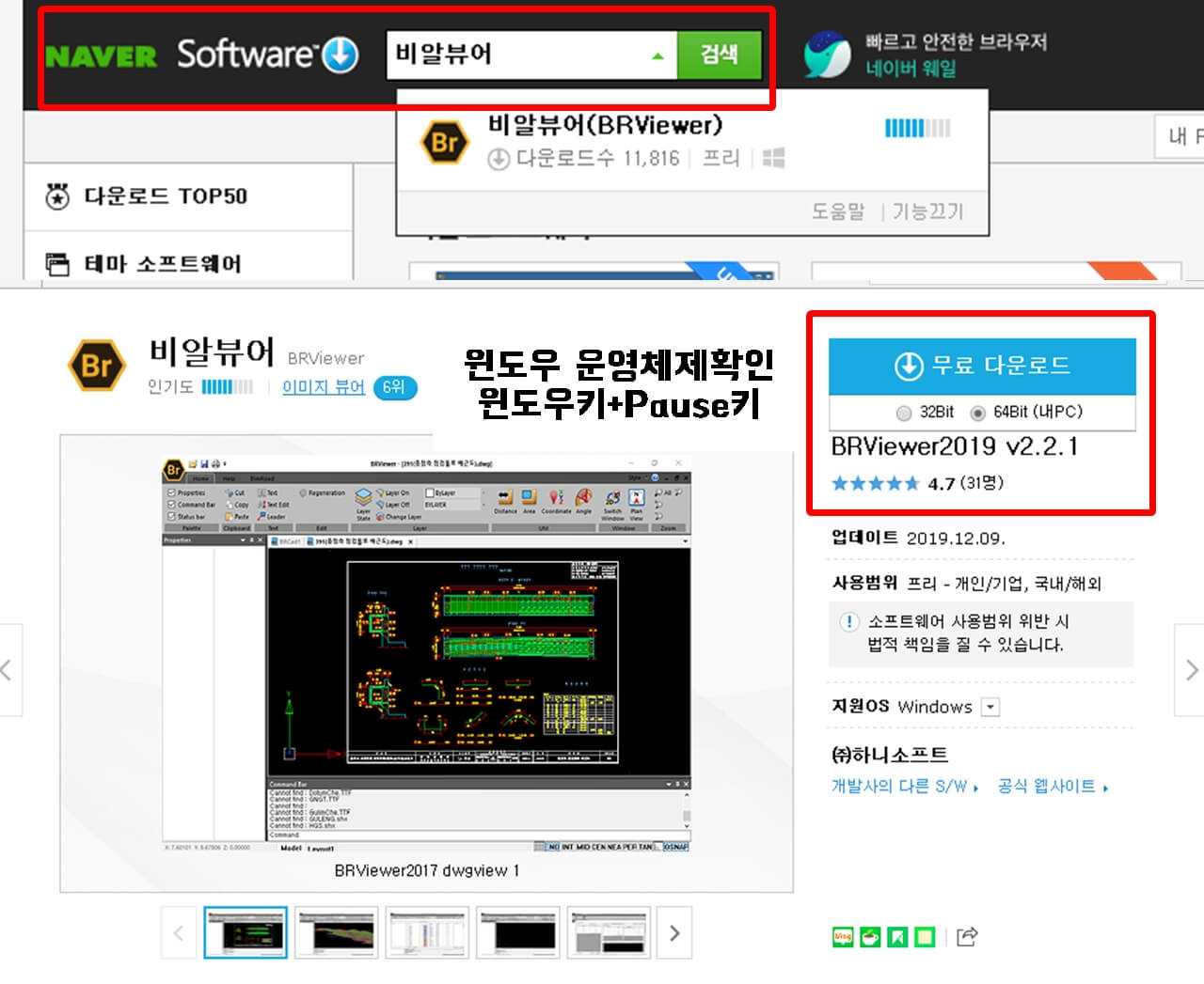따로 오토캐드가 없는 상황에서는 DWG파일을 보기위해 비알뷰어 라는 프로그램을 받으시면 됩니다. 다운 방법은 네이버 소프트웨어에 가셔서 BR뷰어를 검색하시고 다운 받으시면 되는데요. 무료로 진행이 가능하며 사용이 간편해서 많은 사람들이 가볍게 이용할 수 있는것이 장점입니다.