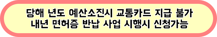 ✔ 예산이 모두 소진되었다면 교통카드 지급은 불가하지만 내년도 면허증 반납 사업 시행시에 교통카드 신청이 가능합니다. 사업 예산이 모두 소진되었기때문에 올해에는 지급이 되지 않아도 내년에 받으시면 됩니다.