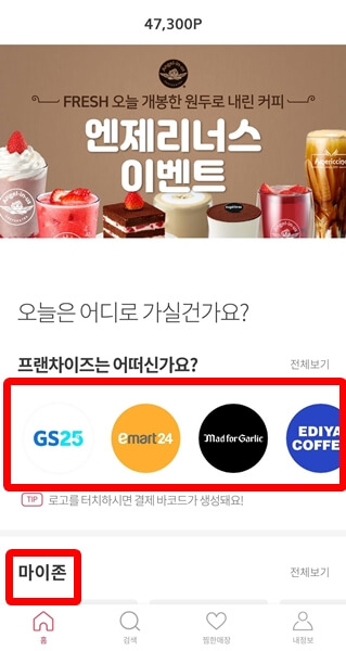 결제방법은 굉장히 간단합니다. 어플에서 마이존을 보시면 가장 가까이 위치하는 매장이 뜹니다. 그 매장을 클릭하시면 바코드가 뜨게 됩니다. 직원에게 보여주시면 바코드를 찍으시거나, 모바일쿠폰번호 입력창에 머지포인트 바코드번호를 입력하게되면 결제가 되고, 내 어플에는 결제되었다는 알림과 금액이 뜨게 됩니다.