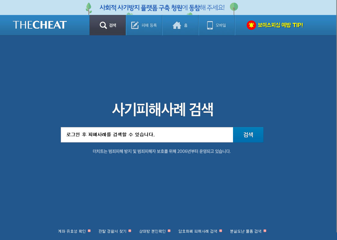더치트 홈페이지에서는 계좌번호와 핸드폰번호로 사기피해를 막을 수 있게 도와주고 있습니다.