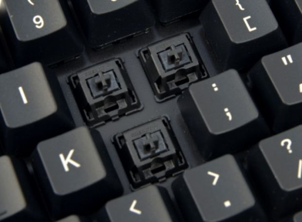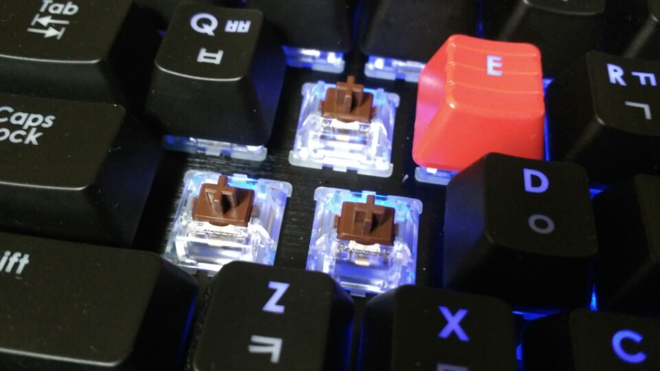 키감이 특출나지도 소리가 조용하지도 않은 어중간한 제품입니다. 적축에 비하면 타건감이 살아있으나 기계식 키보드 특유의 시끄러운 소리는 적은 제품으로, 큰 소음을 싫어하나 기계식 키보드 고유의 타건감을 느끼고 싶으신 분들은 사용해도 좋은 갈축 키보드입니다. 클릭 방식의 키보드와 유사한 슬라이더 방식의 키보드 구조입니다. 특유의 클릭음이 없는 일체형 슬라이더로 제작된 방식이라 소음이 적고 일반 사무실에서도 사용해도 큰 무리가 없을 정도의 키보드 소음이 납니다. 스위치의 압력은 약 45g(±20)입니다.