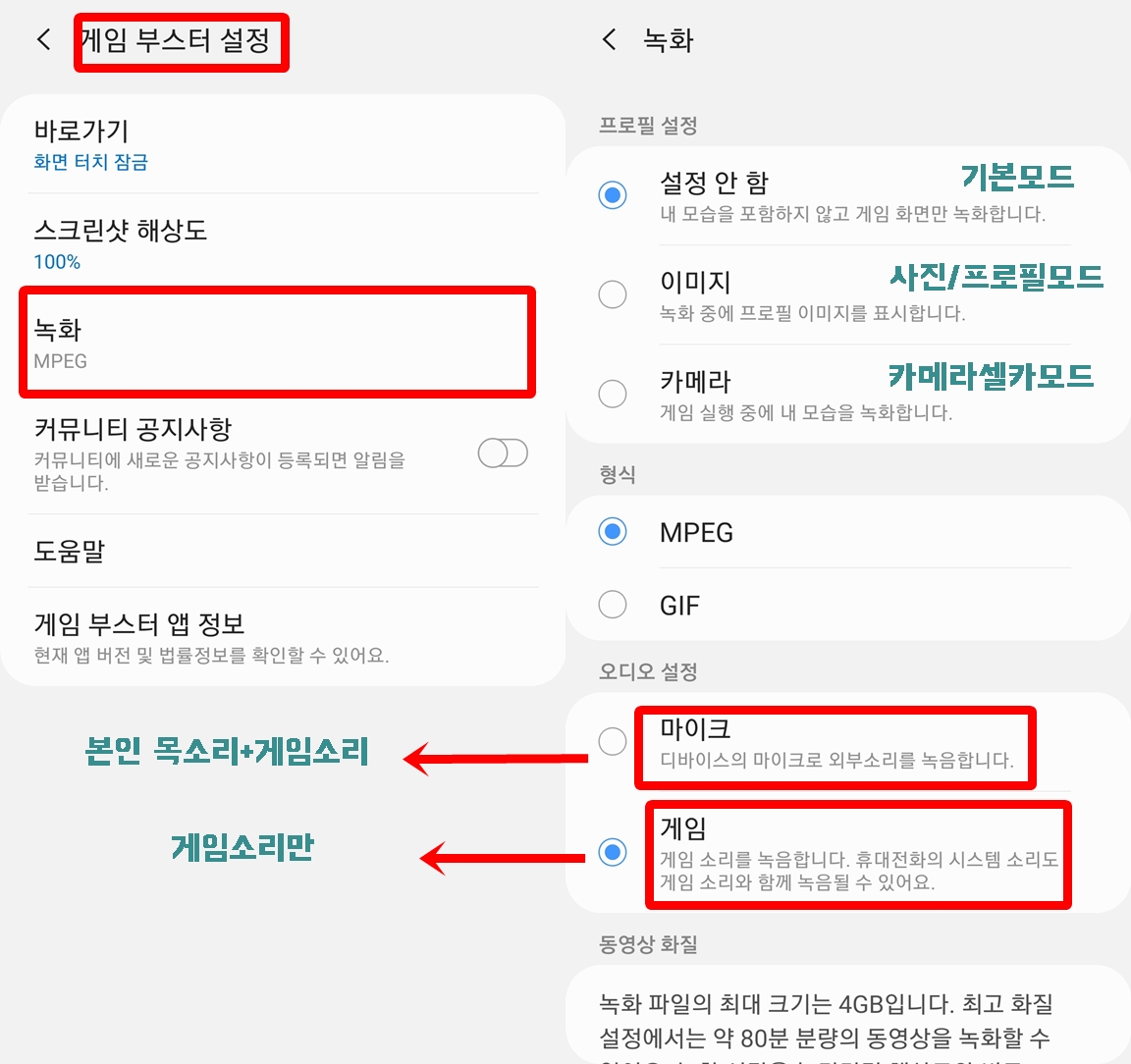 게임 영상 유튜버 분들은 녹화 프로필 성정에서 카메라+하단에 마이크를 선택하셔서 녹화하시면 됩니다.