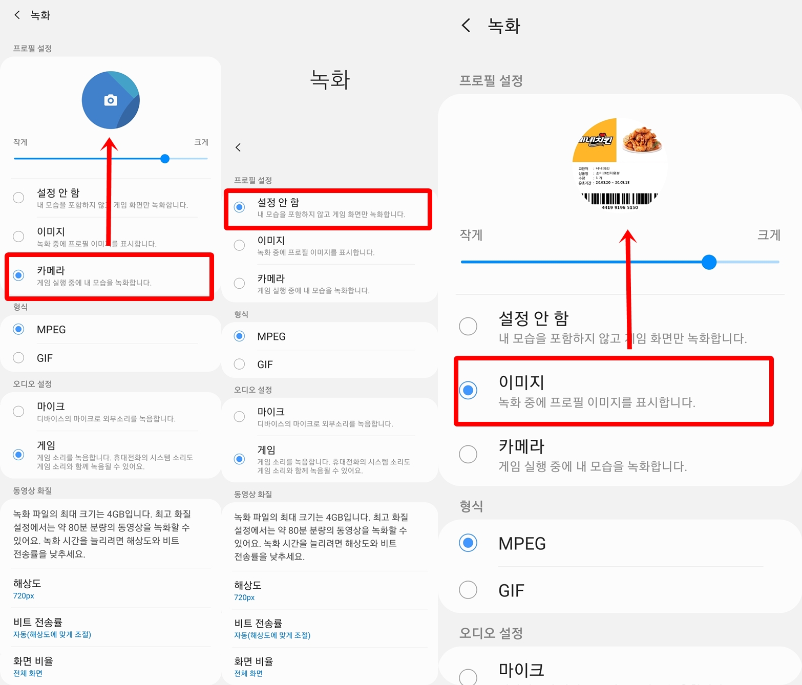 첫 번째 사진은 본인 얼굴이 나오게 셀카 모드로 촬영하는 카메라 모드입니다. 프로필 사진을 작게, 크게 조절할 수 있으며 게임 녹화 화면에서는 본인 화면이 플로팅 이미지로 화면 일정 부분에 위치해 있고, 임의대로 위치를 조절할 수 있습니다. 두 번째는 가장 기본 모드이며 세 번째는 자기가 원하는 이미지를 띄우는데 크기는 설정 화면에서 조절해야 하고 위치는 녹화 화면에서 조절할 수 있습니다.