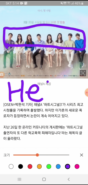 화면 녹화 어플 중에 가장 좋은 기능이라고 생각하는 게 화면에 필기를 할 수 있습니다. 어플 사용 중에 필기를 할 수 있는 게 가장 큰 장점이라고 생각이 되는데요. 따로 영상을 녹화 후에 편집할 때 표시할 수도 있겠지만 즉석에서 바로 밑줄이나 중요 표시 혹은 메시지를 입력하기에는 이 어플이 가장 좋은 것 같습니다.
