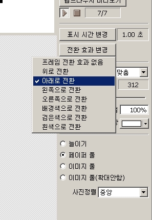 오른쪽에 보시면 표시 시간 병경 전환 효과 변경 크기 조절 등이 있습니다.