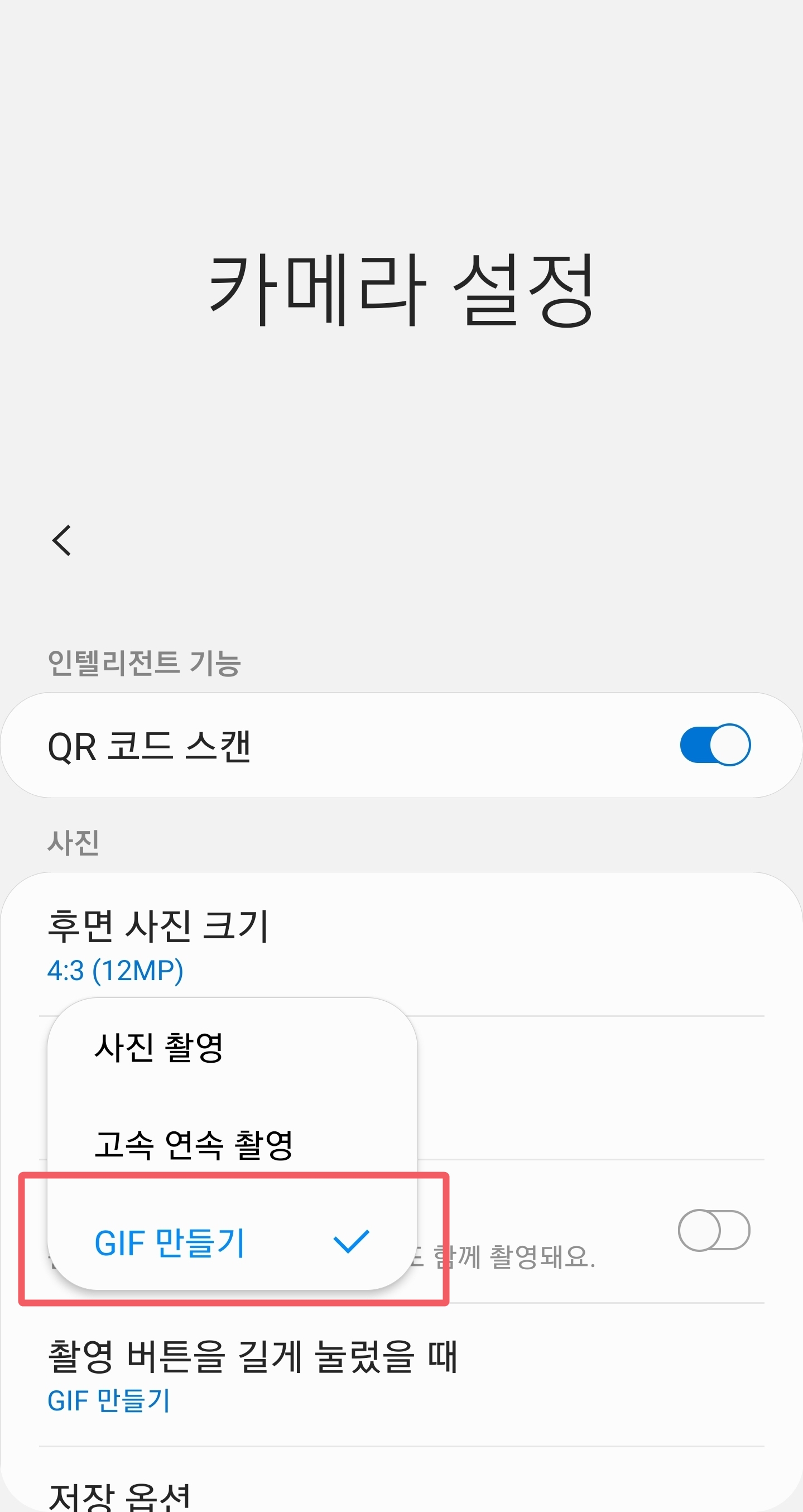 이후 카메라 설정에서 여러 가지 항목이 있지만 촬영 버튼을 길게눌렀을 때 항목에서 대부분 고속 연속 촬영으로 되어있을 겁니다. 하지만 이항목을 GIF 만들기로 바꿔주시면 됩니다. 매우 간단합니다.