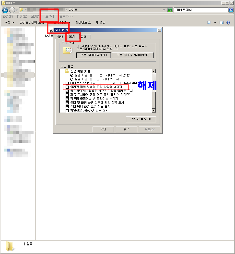 도구 → 폴더옵션 → 보기 →확장자명 숨기기 해제