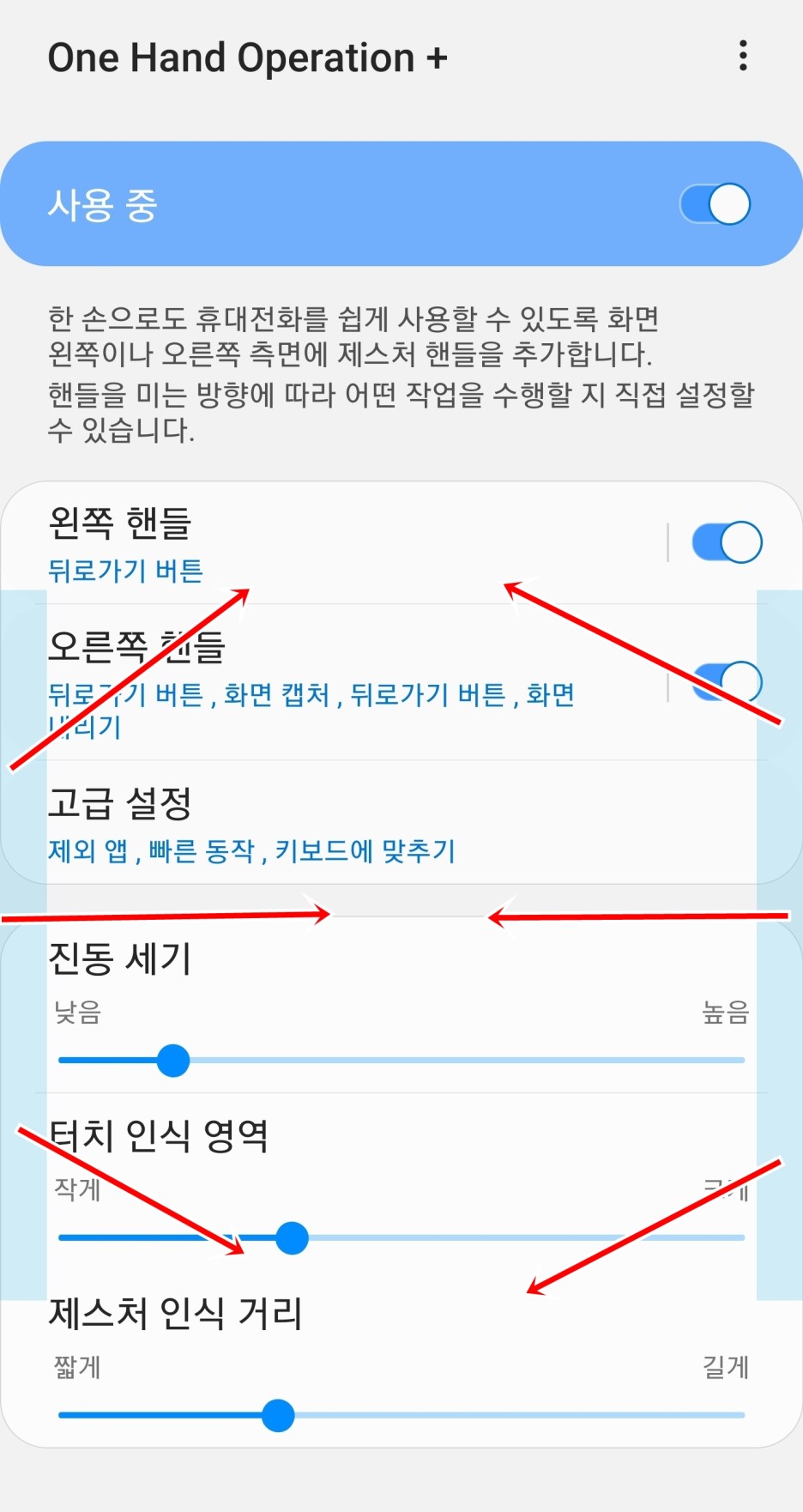 이렇게 가장자리에서 화면을 안쪽으로 툭툭 쳐주거나 스윞해주시면 실행되는 어플입니다. 양쪽에 파란색 부분이 터치 인식 영역입니다. 화면에서도 볼 수 있듯이 크기와 높이 인식거리를 조절할 수 있습니다. 몇 번 사용하시고 본인의 손의 크기나 위치에 맞게 조절하시면 되겠습니다