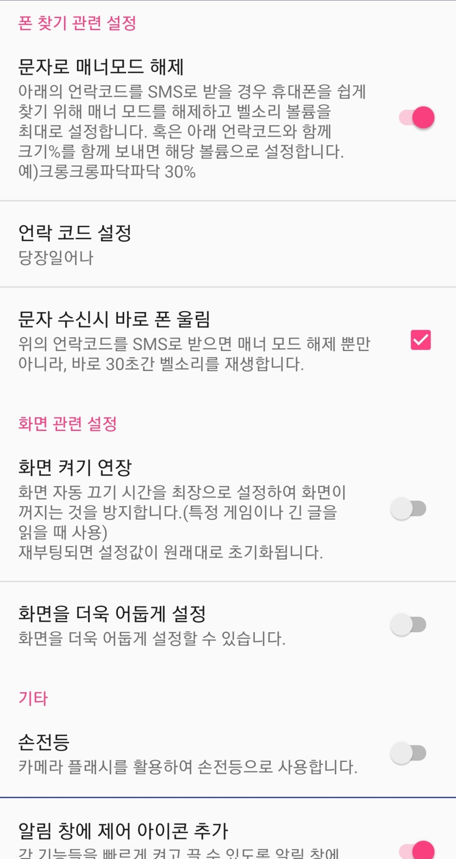 정말 중요한 기능 중에 하나인 것 같습니다 유용하게 사용하는 기능입니다. 위 기능은 특정한 문자를 핸드폰에 수신했을 경우 무음 모드 매너모드를 해제하고 30초 동안 벨소리가 울리게 하는 기능입니다.