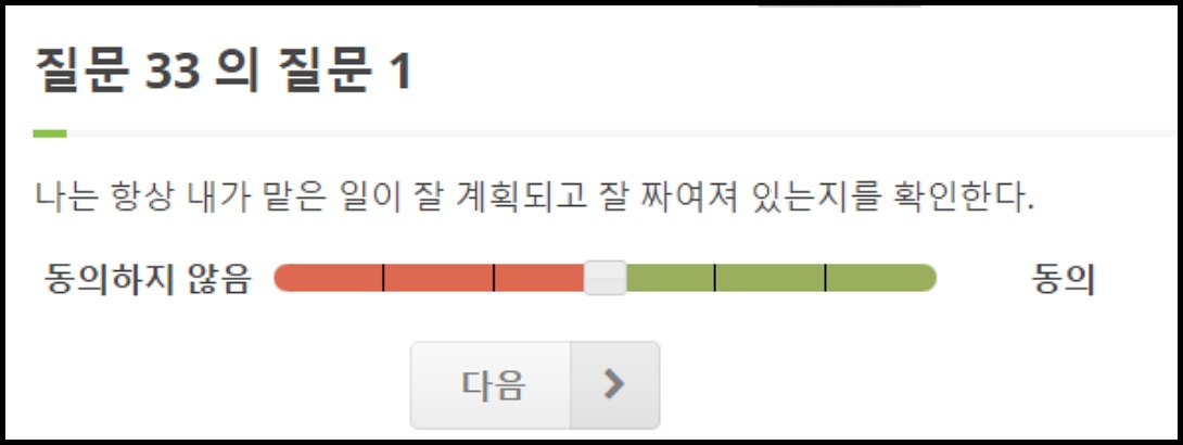 테스트는 33개의 질문으로 이루어져 있으며, 동의와 비동의의 점수를 매기면서 나를 테스트할 수 있습니다.
